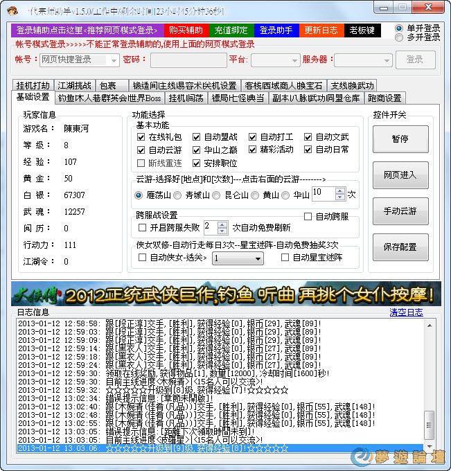 【輔助名稱】 台服一代宗師輔助-一代宗師助手歡迎免費24小時測試! 【目前功能】 1、自動任務 2、自動在線禮包3、自動跑商設置 4、自動打工 5、自動文武 6、自動雲游 7、自動華山之巔 8、自動精彩活動 9、自動