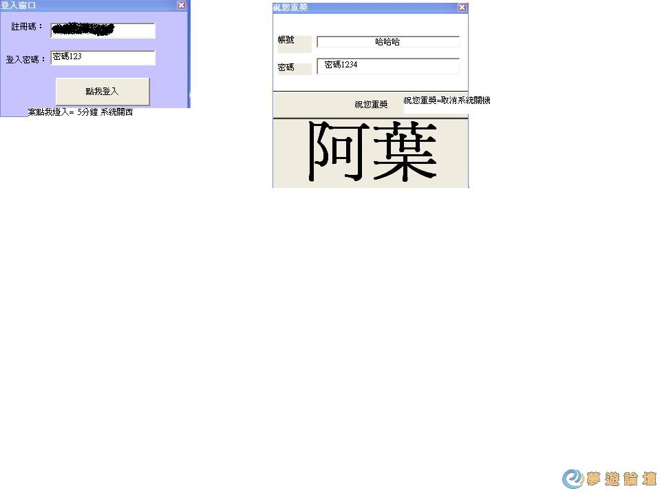 系統關機5分鐘強制 att[ach]82490[/attach] 個人製作 打開 會要你打密碼 密碼請輸入123 然後 會 跑出系統關機倒數5分鐘 和 第2個視窗 第2個視窗 打入 密碼 1234 案