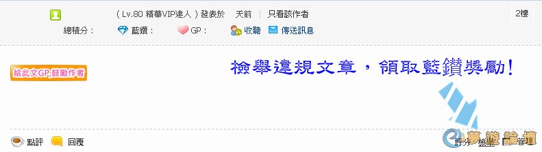 論壇時常有些新會員,未詳閱壇規就發文回復. 打上幾個字、複製幾個字就想看主題所隱藏的文章~ 希望所有夢遊論壇的會員們都能好好的回覆樓主所發的文章~ 在這邊提醒大家,檢舉違規文章(檢舉流程請往下看), 可以領取藍
