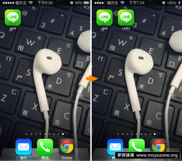 replyreload += ',' + 1717602;修改完畢後,主畫面上就出現兩個LINE APP,做到這麼有沒有感覺好變態、很邪惡?這不是放好看,這是真的可以同時登入兩個LINE帳號,可以自己搞個LINE分身帳號,但可千萬不要拿來做壞事