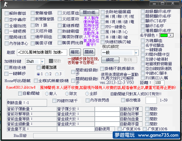 replyreload += ',' + 1729006; 支持操作系統:XP/Vista/Win7/Win8 32/64bit 本次更新說明: 跟隨遊戲更新 移除卡出地圖(和諧) 新增修改噴漆 災厄卡出地圖腳本修改為掛機滑鼠腳本 已知問題: 名字顯血開啟後自動開