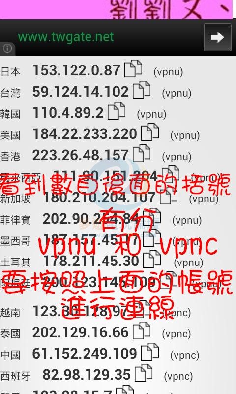 正文摘要:簡易vpn教學【可ˇ已拿到別國的貼圖】 LINE 不能榜定手機號碼 Free VPN Password (試用帳號的密碼) Version (版本): 3.2 Update (更新時間): 2013-11-12 Purpose (說明): 從網際網路上取得VPN的密碼, 但是每次都開網頁來看密碼覺得太麻煩, 寫一支App 來代勞. Download (下載): P.S. 程式下方可查尋免費貼圖【通常為星期2】 ===================== Q&A ===================== Q: 跨區下載貼圖, 我的手機或平板, 需要ROOT 或 JB 嗎? A: 不需要ROOT, 一般的Android/IPHONE/iPad 手機或平板即可, 透過電腦 + Android 模擬器也可以取得貼圖. Q: 有需要連線到VPN嗎? A: 完全需要透過VPN連線到其他國家進行下載。 Q: 我VPN都連失敗. A: 透過 "免費" 的試用帳號連結 FlyVPN時, 因為是免費的所以連線失敗是正常的, 需要多試幾次或在半夜連,如果是連日本, 也可以使用 49.212.0.54(需要用eMail 申請帳號) 這一個免費vpn滿好連的。FlyVPN連不上去原因有二: 第一:伺服器位置、帳號、密碼其一錯誤.第二:太多人使用造成壅擠,建議換個時段在連看看. 由於FlyVPN的密碼短時間內不會變更. Android 2.3.x 版的用戶無法儲存 VPN 的密碼, 建議使用 Free VPN Password 這個App, 透過直接貼上存放在剪貼簿裡的密碼, 可以在縮短的連線的時間, 以增加重試的次數, 重試的次數多, 就比較容易連的上, 如果是 Android 4.0 以上的VPN 建議儲存密碼, 一直按"連線" 就可以直接重試. Q: 用 eMall去申請帳號, 是不是會比較好下載? A: 用 eMail 去申請的那組日本的VPN主機(49.212.0.54)比較好連上, 幾乎每次一連就可以連上, 所以的確是比較好下載. Q: 連VPN到國外取得貼圖時是要用Wi-Fi,或是用3G就可以了? A: 都可以唷~, 不管 3G 或 Wi-Fi 只要能上網就可以. Q: 一定要移除手機門號綁定? A: 對!建議移除門號的綁定, 改綁Facebook, 並使用Facebook 登入 LINE 會比較簡單一下. 請參考看看移除LINE電話號碼綁定教學: http://max-everyday.blogspot.com/2013/04/line-remove-phone-number.html (說明: LINE 帳號要先綁好Email 和 Facebook, 如果有重要的交談記錄, 請先備份, 因為會消失, 曾經下載過的貼圖經在重新登入LINE 後, 用貼圖管理員重新下載即可.) Q: 如何確定LINE有沒有綁定門號? A: 請打開LINE,其他→設定→我的帳號 Q: 為什麼LINE一直要求電話驗證? A: 請同時綁定Email跟Facebook,並使用Email登入。LINE 彈出電話號碼驗證的畫面時, 請選擇下方的『使用Facebook登入』. Q: 要下載圖案時, 怎麼加LINE的好友啊? A: 要先 "強制停止" 一下 LINE App, 而且成功VPN連到國外即可加入好友. Q: "強制關閉" App , 然後點我要的圖, 免費上面寫 "無法選購"(或在下載免費貼圖時無法加入好友). A: 請先檢查你的帳號是否有綁定電話號碼, 如果你的帳號沒有綁定電話號碼的, 請 "強制關閉" LINE App 後再試一次. Q: 成功連上國外VPN後, 看不到免費貼圖只看到付費貼圖 A: 請先檢查你的帳號是否有綁定電話號碼, 如果你的帳號沒有綁定電話號碼的, 請 "強制關閉" LINE App 後再試一次. Q: 成功連上國外VPN後, "強制停止" "清除資料" "uninstall line" 也分別試過了, 還是顯示 "無法選購"(或在下載免費貼圖時無法加入好友)不能取得貼圖. 是那裡出錯? A: 請先檢查你的帳號是否有綁定電話號碼, 如果你的帳號沒有綁定電話號碼的, 請 "強制關閉" LINE App 後再試一次. Q: 已經成功連上國外的VPN, LINE 的帳號也是用eMail 登入, 也強制停止, 還是一樣顯示 "無法選購"(或在下載免費貼圖時無法加入好友), 不能下載貼圖. A: 請試著關閉 wifi, 手機進入飛安模式後, 然後重新開啟wifi, 再重新連到國外的VPN 一次看看, 有時候系統就是會怪怪的, 也可以試試看重開機. (重開機治百病, 包括台灣高鐵的信號異常). Q: 如何 "強制停止" LINE 應用程式. A: Android 平台的話可以在 "應用程式管理" 的地方, 對應用程式做移除或強制停止. iPhone/iPad 的話就是點2下 Home 鍵, 把 LINE App 按 x 關閉即可. Q: iphone哪裡可以停止和清除資料 A: iPhone/iPad, 請點2下 Home 鍵, 即可強制關閉 LINE App. Q: 透過 Windows 電腦, 可以取得 LINE 貼圖嗎? A: 可以哦, 透過 Windows 設定 VPN 後, 再執行 BlueStacks 或 Android 模擬器即可. 參考看看圖文教學: http://max-everyday.blogspot.com/2013/02/bluestacksline.html Q: 為何要把LINE強制停止? A: 因為要讓 LINE 重新和LINE 的伺服器連線, LINE 的主機會依照你目前的 IP Address 來判斷你的LINE帳號屬於那一個國家別. 如果你設了VPN 連到國外, 這時候就可以下載(或購買)到國外的貼圖. Q: 請問iPhone/iPad怎麼跨國家取貼圖? A: 參考看看教學: http://max-everyday.blogspot.tw/2013/04/flyvpn-iphone-ipad-line-sticker.html Q: iPhone/iPad/iTouch 如何連上VPN? A: 參考看看教學: http://max-everyday.blogspot.tw/2013/04/flyvpn-iphone-ipad-line-sticker.html Q: 為什麼有這麼多貼圖可以抓? A: 這些貼圖都是LINE在各個國家推出的活動免費圖。 Q: 這樣會導致LINE帳號被封鎖嗎? A: 不敢保證, 但目前沒有聽說任何人遭到封鎖, 只有部分活動送的貼圖被官方收回去(貼圖顯示已逾期)。 Q: 哪時候會有新的貼圖? A: 我不是LINE公司,我沒辦法準確地告訴你哪時候會出新貼圖,但是依照目前的週期看來是: 每週二上午10點 (免費圖)每週四上午10點 (付費圖,但有時會有免費圖)每週五上午10點 (活動圖、免費圖) Q: 哪邊可以看到最新的貼圖資訊? A: 參考看看許願貓的網站 http://www.gpx.idv.tw/line_stic/list.php?price=free Q: 付費的貼圖可以抓嗎? A: 可以呀...付錢給LINE就可以抓了 XD Q: 過期的貼圖還能抓