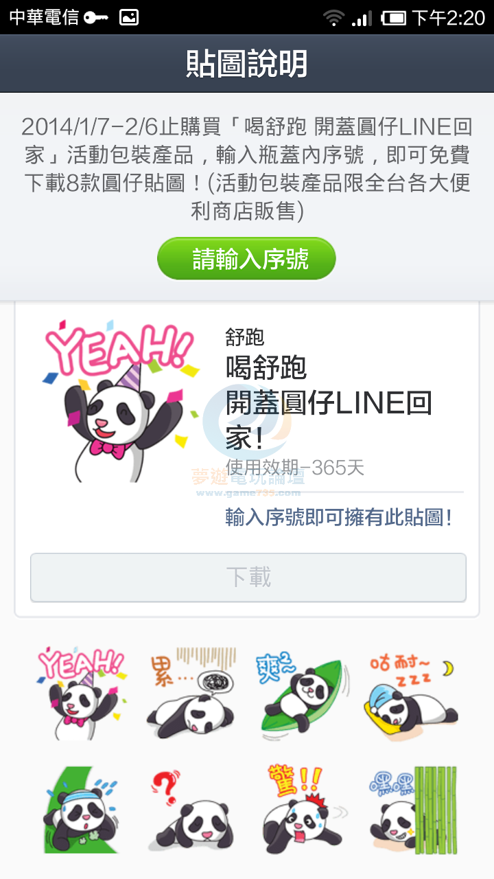 2014/1/7-2/6止購買「喝舒跑 開蓋圓仔LINE回家」活動包裝產品,輸入瓶蓋內序號,即可免費下載8款圓仔貼圖!(活動包裝產品限全台各大便利商店販售)