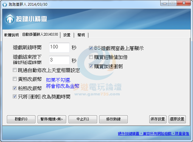 replyreload += ',' + 1800602;如果自動修改有問題的版友 請勾選 跳過自動修改 按保存設置 重新啟動精靈 , 請自行手動修改數據 修改好之後 再按 開始 即可 如果會跳進禮物箱那邊,請將遊戲結束按下確認的時間改長一