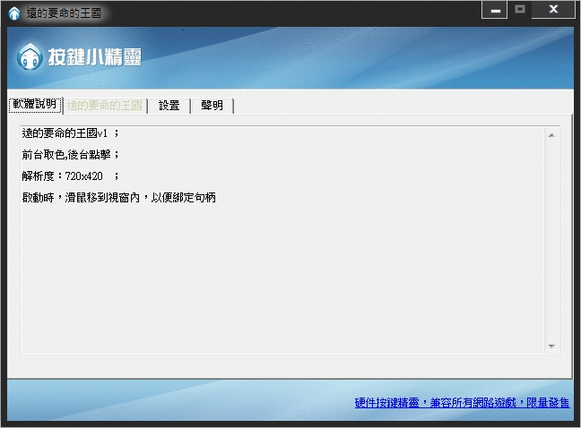 replyreload += ',' + 1826044;先放一張,程式的照片 使用方法: 1.解析度720x420 2.啟動時(F9),滑鼠需在視窗內,綁定句柄(視窗) 3.我是用後台點擊,移動+前台找色判定(BS不能後台) 4.特別注意,在副本開始前,會有