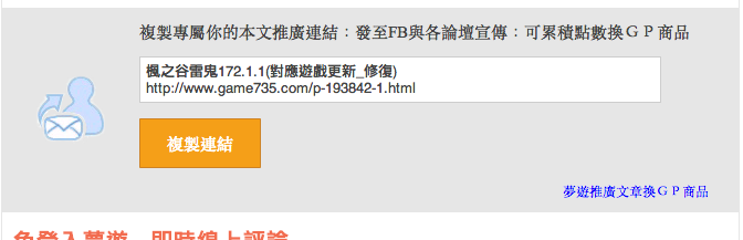 此活動目前進入Beta測試中論壇上方導航列可以看到推廣中心連結,點我入內。 登入會員後即可看到專屬連結 每天輕鬆賺遊戲點卡: 將文章拉到底下的,找到您專屬的推廣網址,複製貼上給你的好友 系統會自動累積您的推
