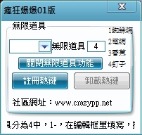 更新內容:增加無限蜘蛛網、電網、香蕉、釘子 功能說明:先選擇想要的快捷鍵,註冊,然後輸入功能代碼,就可以使用,不需要時即可卸載或關閉。 使用步驟:將dwk解壓縮,然後把DLL放置到爆爆王目錄,開啟遊戲就會跳