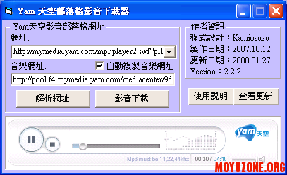 軟體資訊: ◎軟體名稱:Yam 天空部落格音樂下載器 ◎程式版本:2.2.0 ◎開發日期:2007年10月12日 ◎更新日期:2007年01月27日 ◎作業系統:Windows2k / XP / Vista ◎程式環境:WinXP Pro SP2(32bit)、Inter