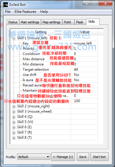 replyreload += ',' + 1882759;很多人還是不是很明白POE Exiled bot的一些設定 這邊做些詳細的解說 打開 skill.ini 可以看到其中一組按鍵設定 ; Set here the key or the mouse button of the skill. skill0_key=