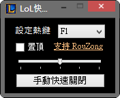 replyreload += ',' + 1890458; LOL Closer 2.0 正式版使用方法: 1.設定按鍵 2.調整辨識度 愈左邊辨識愈好 反之愈右邊則愈糟 最糟按住1秒多即可偵測到 3.縮小時會自動縮小至右下角 滑鼠點擊兩下即可開啟