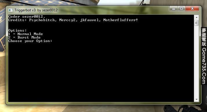 replyreload += ',' + 1944552; How to use: 1. Run CS GO 開啟遊戲 2. Start Triggerbot 開啟 BOT掛 3. Set the Option, Normal Mode = 1, Burst Mode = 2. 選擇模式 4. If you are in a Game press insert to togg
