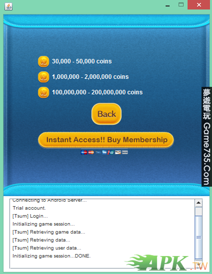 replyreload += ',' + 1961209;要用電腦使用,使用時手機不能登入遊戲,試用版只能兩天用一次,一次領3~5萬個金幣,要一直使用的話是要付錢的喔,把它當作是兩天領一次禮物吧! LINE Login打你的帳號 Password打密碼