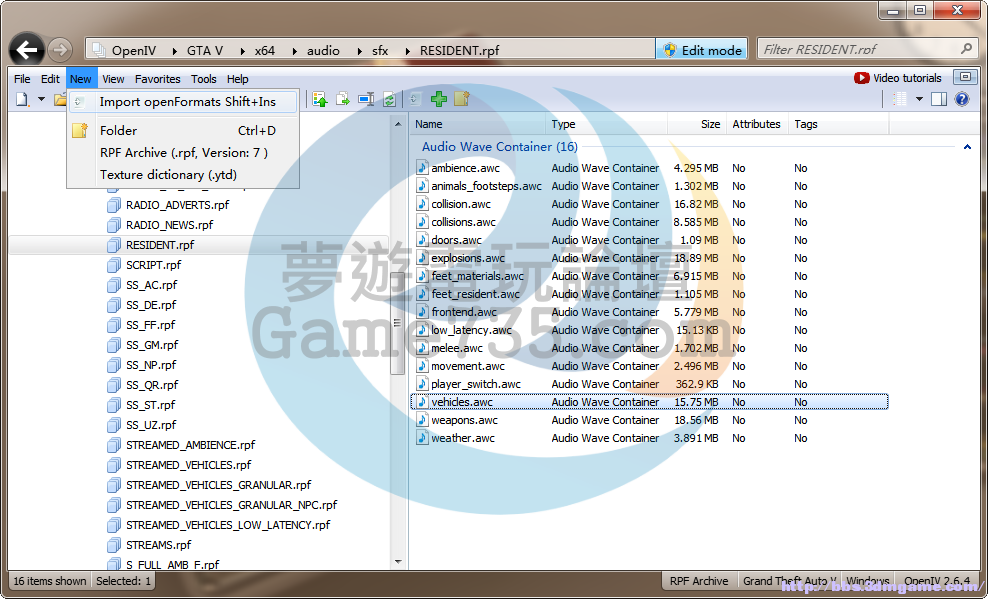 replyreload += ',' + 1973035;老外的修改的速度真快,這麼快就有了 關於汽車音效方面的MOD 此MOD的安裝方法比較特殊 1.打開OPEN 2.6.4(鏈接:CC) 2.打開編輯模式,找到目錄 路徑:x64> audio> sfx> resident.rpf