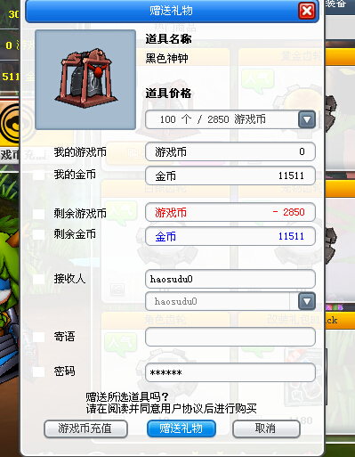 replyreload += ',' + 1980243;【7/29】台服相同原理適用 不需要軟件,一個小BUG而已。 上號 進入商店,點擊贈送神鐘。隨便送,沒遊戲幣會出現發生未知錯誤,點擊確定,返回主界面 看積分也是有加的。 可以無限循