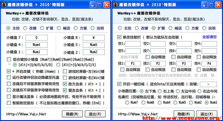 4月21號 WarKey++ 2010b1 更新: 1、新增了顯藍(魔法條)功能 2、新增了可修改所有技能(12格技能欄) 3、新增了對一些可自動釋放的技能做了可改支持 4、新增了一鍵回城的功能(支持DOTA/3C) 5、新增了支持多配置方案