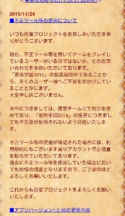 大致就是為了這次使用不當工具的問題 在這次茶熊學園2016投票期間造成多數玩家不安,深深的致歉。 本次投票中,營運方面的處理, 對於不正當的票將不會反映在票數上。 對於確認使用過不正當工具的帳號,也會