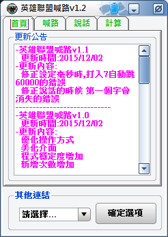 replyreload += ',' + 2004029; 【程式名稱】英雄聯盟喊路v1.2 【發布時間】2015/12/03 【程式撰寫】VB6 【本次更新】 -新增KDA計算(自動/手動) -開啟速度優化 -修復全頻打字時,只會打在我方頻道的錯誤 【程式功能】