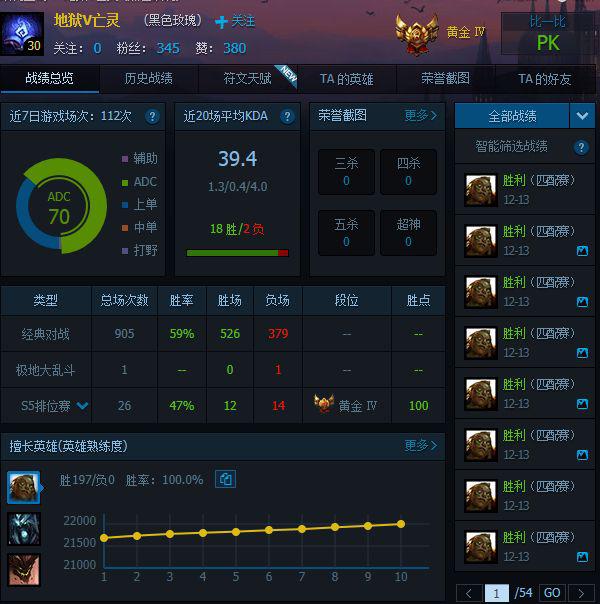 最近新英雄俄洛伊上線,部分玩家表示想學習一下高手是怎麼玩的,結果發現一位「大神」,新英雄熟練度兩萬多,而且是197場連勝勝率100%!戰績如下圖: 也就是說目前一些代練網站上刷熟練度和刷金幣的業務很有可