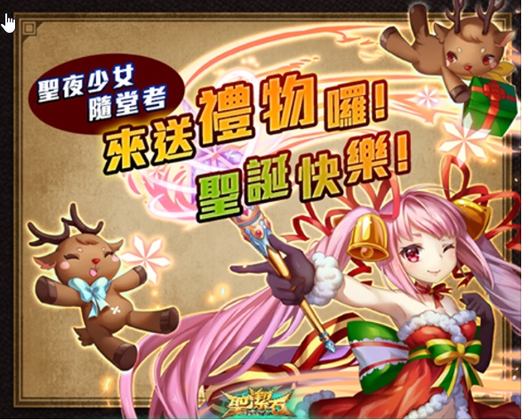 聖誕節的聖誕禮物來嘍, 12/21起至12/24晚上23:59前, 去到聖潔石粉絲頁回答問題, 就能夠拿到: 「曜石*10」、「金幣*100000」、「雪晶兔*10和薑餅執事*10」等多項禮物。 只要回答幾個簡單的問題並且留言在該