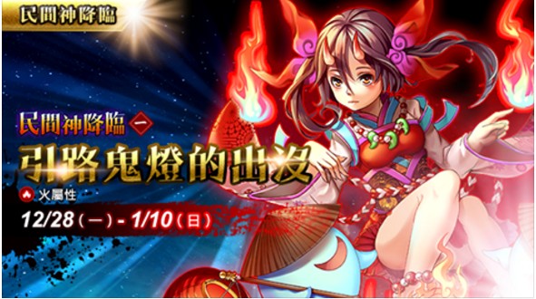 開放時間為12/28(一)6:00 至 1/10(日)23:59 這是民間神降臨系列的第一話? 其實我也不知道會不會有第二話,但都說第一話了應該會有吧。 這是一隻火屬四星起手的角色,最高可以升到五星,主動技