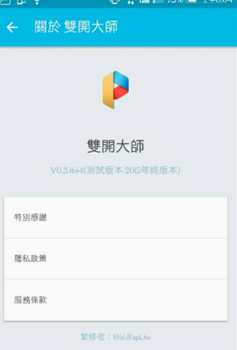 replyreload += ',' + 2008747; 【語 言】繁 【軟體名稱】雙開大師 【版本資訊】v0.3.1614 【軟體大小】1.55MB 【更新日期】2015/12/31 【使用權限】免費 【系統支持】支持An
