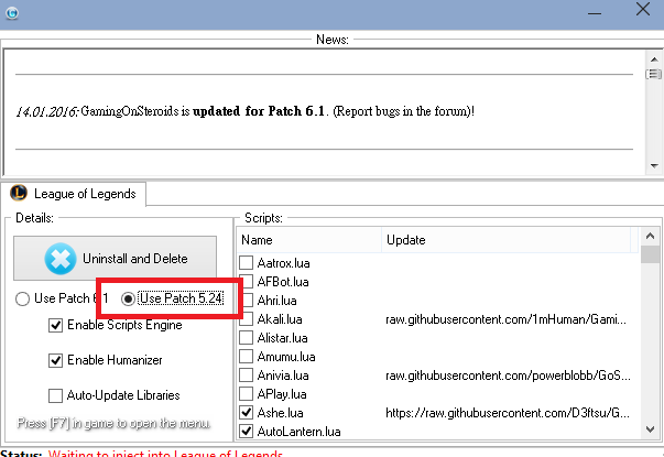 因為美版已經更新 6.1 台版仍停在 5.24 所以 GOS Loader 請選擇 5.24 版本 ~~~