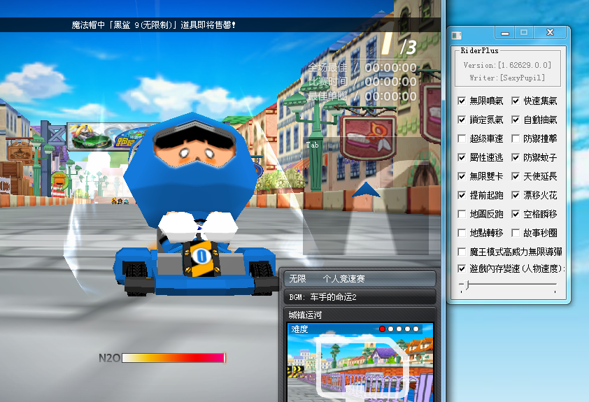 replyreload += ',' + 2012995; 無限噴氣:按前進即噴氣。 無限尾氣:甩尾噴氣無限延長。 超級車速:車速遞進疊加超高速。 快速抽氣:增加抽氣進度。 自動抽氣:自動增長氣體。 鎖定氣體:鎖定氣體條滿氣狀態,