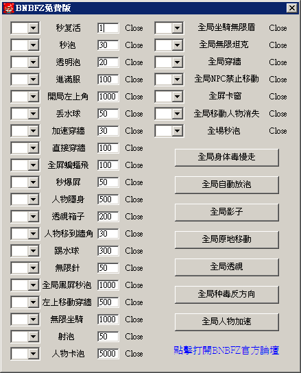 replyreload += ',' + 2014812; 【BNBFZ功能說明】 秒複活:進泡後按下功能鍵立馬逃離泡泡。【注意事項:秒復活請在8秒內使用道具針救活自己,不然會自爆。使用的時候進泡一次按一次才可以複活。】 秒泡:放泡後