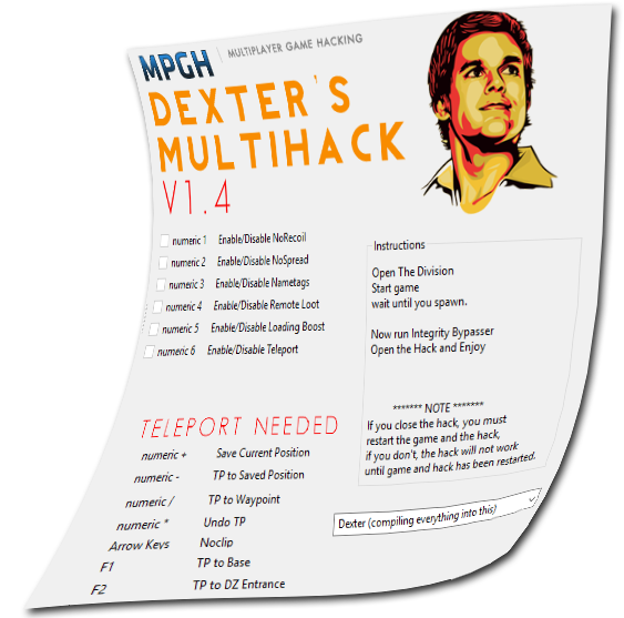 replyreload += ',' + 2022401;Dexter's MultiHack - 全境封鎖 0331 V1.4版 新功能 快速撿物/傳送/標籤/加速副本讀取 使用說明 請務必先啟動 防崩潰器 再開此輔助 下載: 所有站內附件皆會附上安全掃描報告