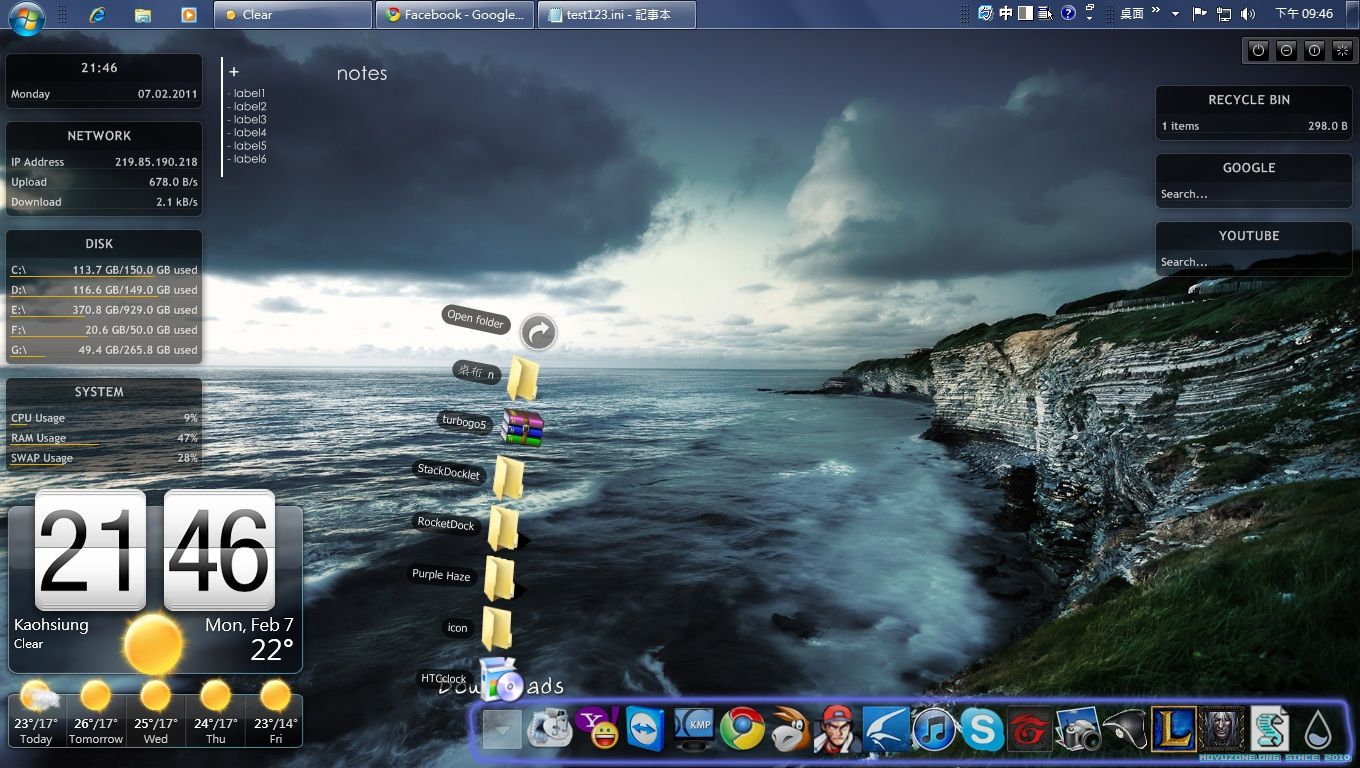下面是目前整理ing的桌面 給大家看一下XDD 接下來會繼續增加Rainmeter 的skin 然後會再去找一些icon給Rocket Dock用 然後在等一下有沒有特賣會去搬一個1080P的螢幕回家 接下來就是開始電繪桌布(其實到時候大