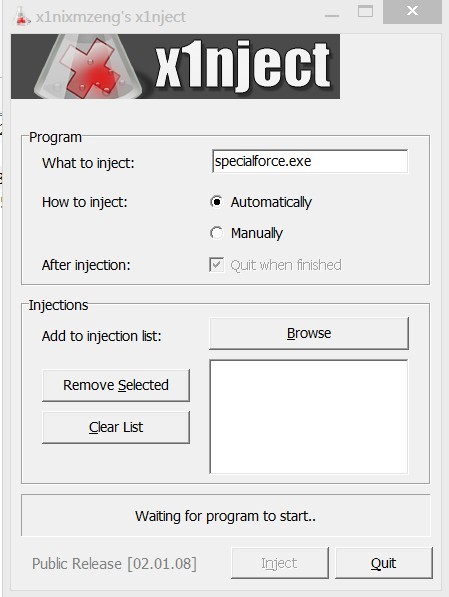 replyreload += ',' + 2028823; 步驟 使用前請自行關閉掃毒軟體以及防火牆 1.注入光驅配合不被偵測dll 2.使用管理員模式執行他 3.What to injector(注入甚麼) 輸入 specialforce.exe 4.Auto(自動)打勾 5.刪除XC資料