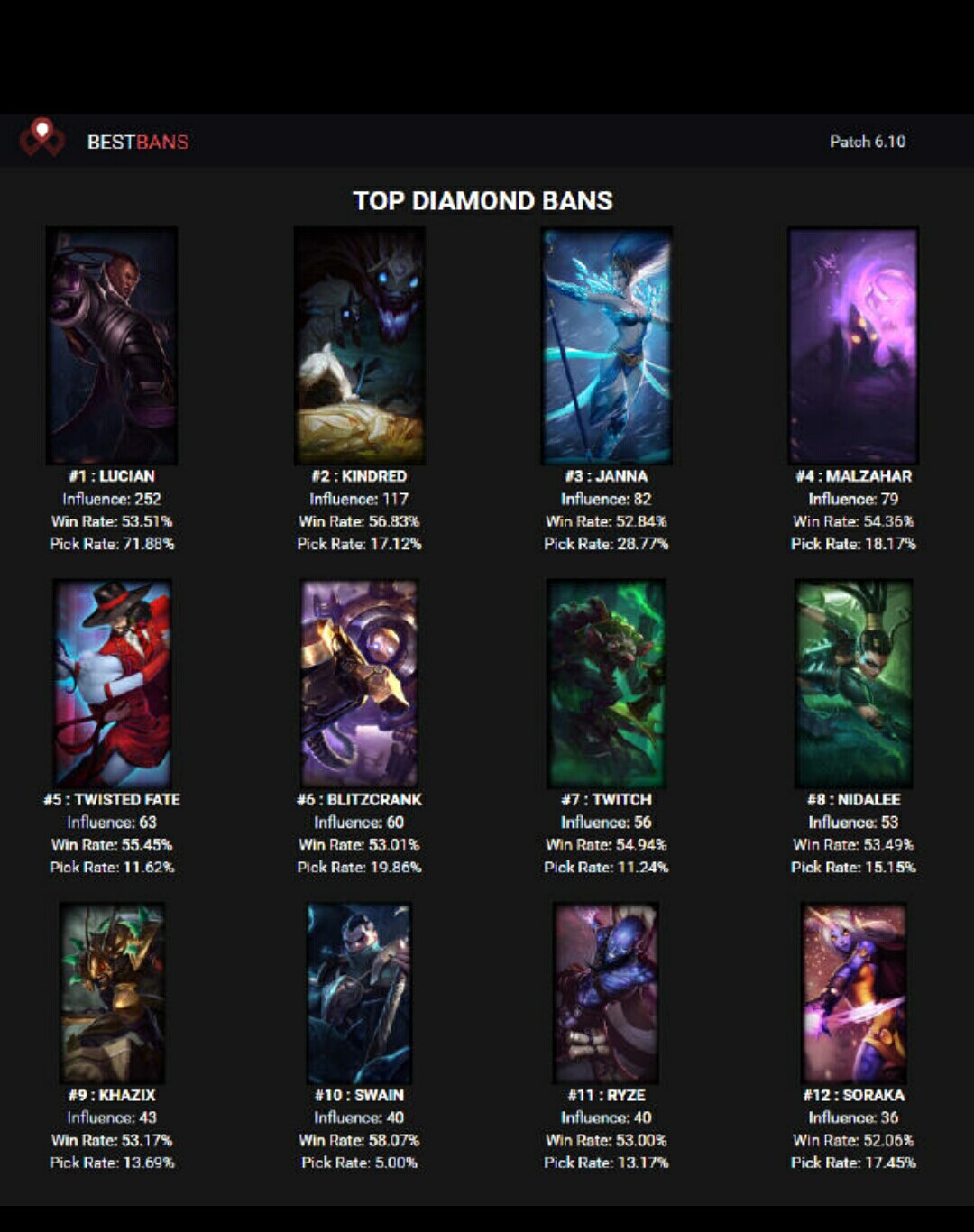 6.10版本在美服已經上線將近一周了,這次的新版本對峽谷格局產生了怎樣的影響呢?論壇玩家Aqua_Dragon聯合兩位程序員為我們帶來了美服各段位影響力排行榜,讓我們一起來看看吧~ 「根據經驗,最優的禁用策略就是能夠