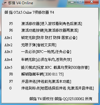 replyreload += ',' + 2035526; 說明: F5 進入遊戲後看到角色後按下 接著 按下 F6 。 熱鍵: ALT+1 無敵 ALT+2 無限子彈 ALT+3 一擊必殺 NPC用 ALT+4 車無敵 ALT+5 毀滅 F8 解鎖隱藏車 F7 開起傳送功能 G 傳送