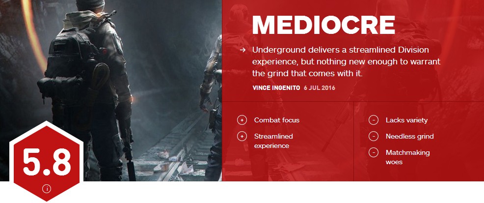 《全境封鎖》地下世界 IGN 5.8 內容不足的中庸之作