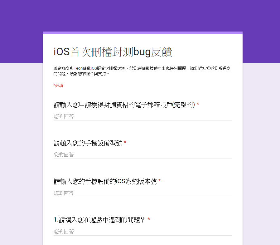 IPHONE / IOS 免費封測申請連結 分享 iOS首次刪檔封測bug反饋 感謝您參與Teon遊戲iOS版首次刪檔封測,若您在遊戲體驗中出現任何問題,請您詳細描述您所遇到的問題,感謝您的配合與支持。 傳送門