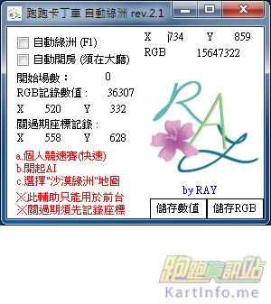 replyreload += ',' + 2043088; a. 把滑鼠移到圖片紅色箭頭的位置,按下F10。 b.將滑鼠離開剛剛儲存的位置,按下"儲存RGB"按鈕。 第二次開啟 : a.螢幕調整齊 b.調整加速速度(30秒以下會斷線) c.開啟房間與AI,