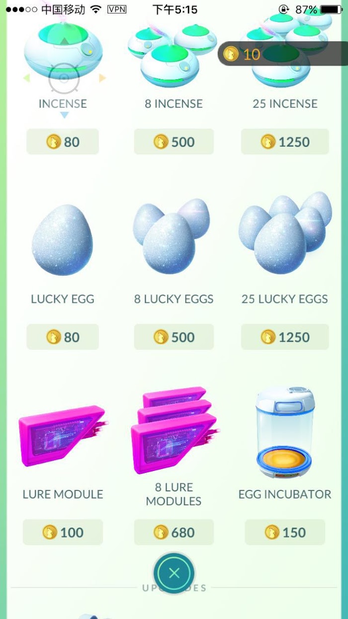 replyreload += ',' + 2043456;關於道具:在PMG的商店中你可以買到:精靈球、香爐(INCENSE)、幸運蛋(LUCKY EGG)、誘惑模組(LURE MODULE)、孵蛋器(EGG INCUBATOR),還有背包擴充(BAG UPGRADE)和精靈擴充(P