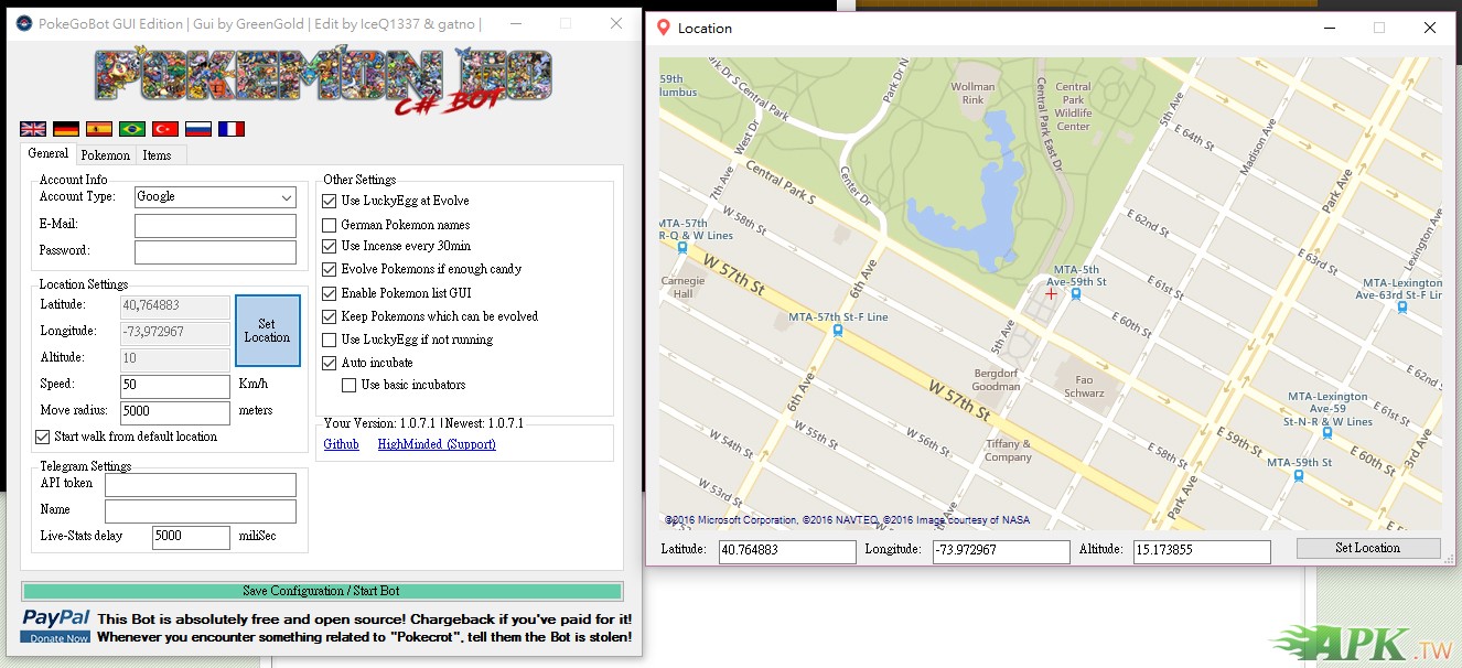 replyreload += ',' + 2047904;簡單易用[color=rgb(68, 68, 68) !important]PokemonGo-Bot 8/8 最新版本 很容易設定 8月8日15時25分更新 1,輸入帳號 2,按Set Location設定地點 4,設定速度 範圍 (我多數設成時速60公