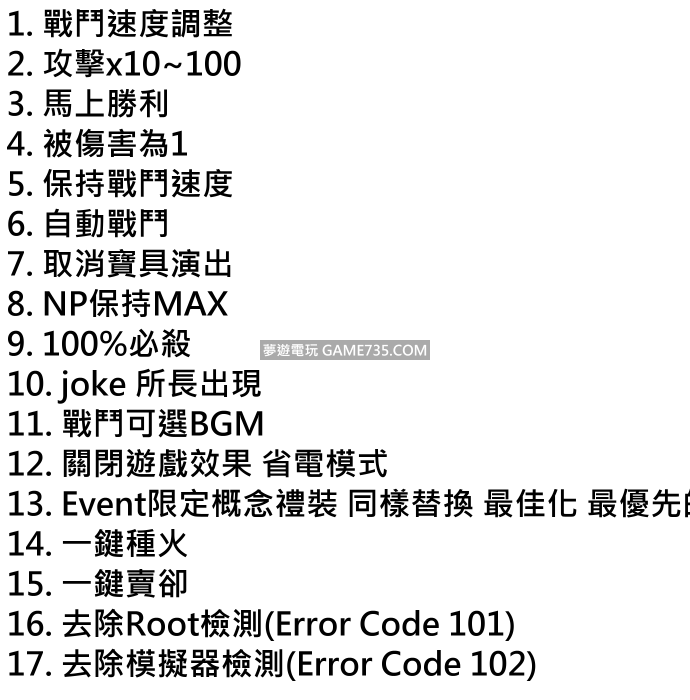 正文摘要:replyreload += ',' + 2051097; [SPD スライダー] 戰鬥速度選擇 [バトル中常に加速する] 始終保持速度之戰鬥,LogicPhase,CommandPhase,BattleActionPhase,ResultPhase [戦闘スキップ] 馬上勝利,類似一回合 [ATK スライダー] 10-100倍的攻擊能力 [被ダメージを1にする] 被傷害1 [オート戦闘] 自動戰鬥 [寶具スキップボタン] 寶具演出取消(這個牛!) [NPゲージMAX] NP時常MAX [直死の魔眼] 100%必殺 (有當場死亡効果的寶具) [ロード中稀に所長出現] joke, 服務器擁擠,CONNECTING...,LOADING..., 在很被等待機的時候,所長出現 [BGM スライダー] 戦闘可以自己選BGM [省エネテスト] 關閉遊戲效果,省電模式 [サポート選択・イベントソートの優先表示設定] Event限定概念禮裝, 同樣替換, 最佳化 最優先的項目的選擇 replyreload += ',' + 2051097; |