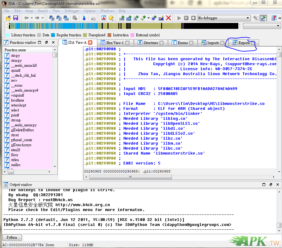 replyreload += ',' + 2053388; 有很多人問,要如何找最新位置 其實超級簡單 工具 : IDA PRO http://pan.baidu.com/s/1kTsXZiJ pass:jj5q 把libmonsterstrike.so拖進IDA PRO 它會提示很多東西,一直o