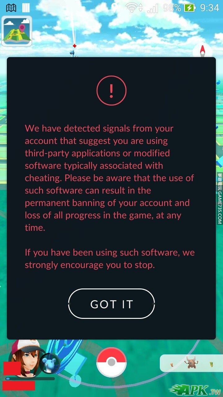 replyreload += ',' + 2064576;10/06 早上,突然收到 Pokemon 官方的警告訊息, 內容大意就是 Pokemon 官方偵側到你用外掛,請你停止使用,否則會砍你帳號 下面是我自己帳號確認的結果, 我本人目前有七個帳號