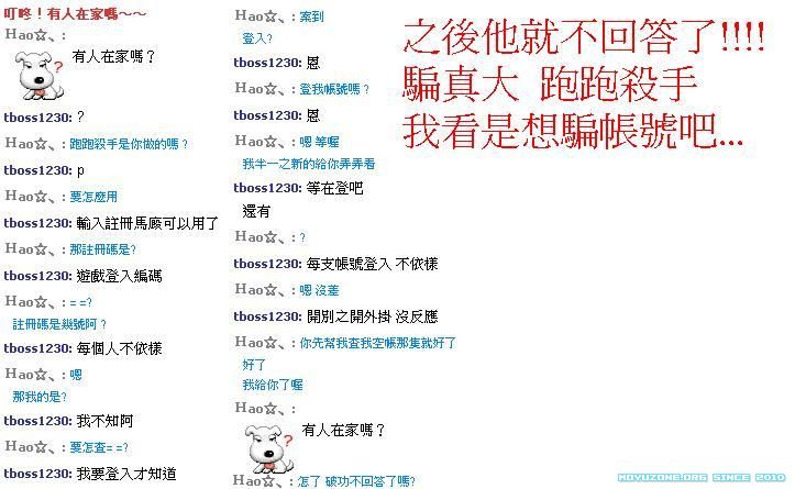日期是1/20 . MuAlston 跟 tboss1230 是同一個人 . 換帳號而已 !! 當初我搓破他謊言他也是賣跑跑殺手 後來還是小粽處理的 . 真不要臉 ! |