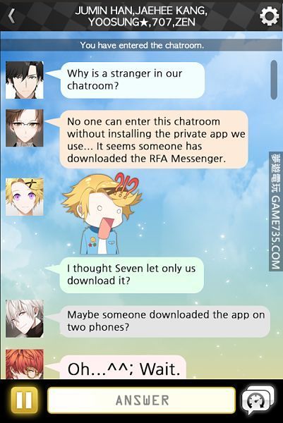 replyreload += ',' + 2070076; 你偶然間發現了一款名叫“Mystic Messenger”的APP,并下載了它。隻要你打開它,這款APP便會接入到一群帥哥的神秘群聊中。你接到電話被邀請加入他們的秘密派對策劃團,故事由此展開..