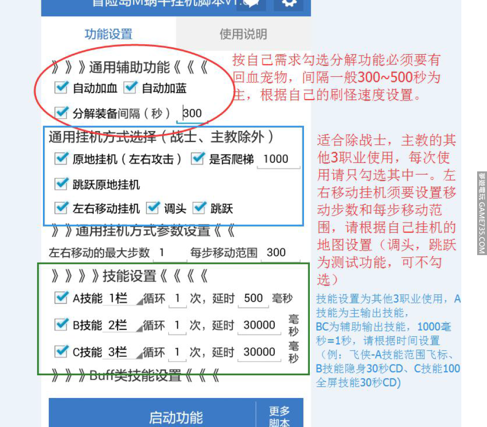 replyreload += ',' + 2073323;本腳本暫時只支持720*1280,1080*1920,及新增2K 分辨率兼容,其他分辨率等待適配。 使用本腳本須要注意的事項: 1. 分解裝備功能請在有加血寵物的情況下才勾選,不然會容易死亡。 2. 通