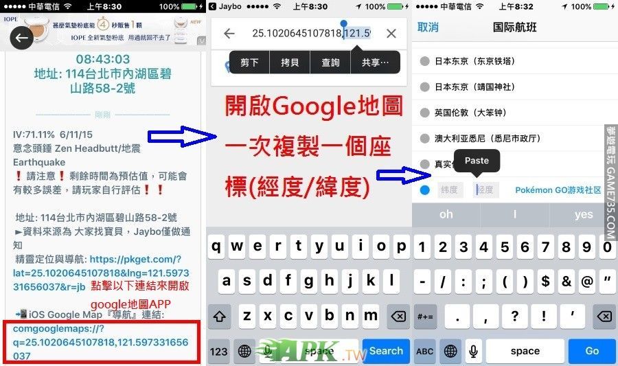 replyreload += ',' + 2075810; 【快速使用果盤飛到目標地點方法】 1.先安裝Jaybo與Google Map (當然果盤是一定要有的) 2.開啟Jaybo點下面IOS Google Map連結..點了會自動開啟Google Map頁面 3.在Google Map畫面