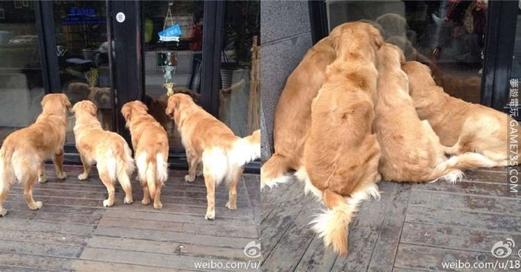 散步到一半…四隻呆萌黃金竟突然在櫥窗前「定格」!她上前查看瞬間被眼前畫面萌翻~