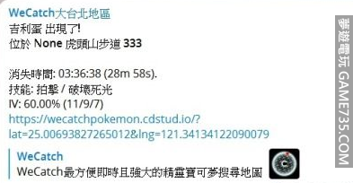 太好了!終於上線了~接下來就等其他地區開放! --- 寶可夢WeCatch即時通知上線 telegram是一套免費好用的APP 目前只開放大台北地區通知 未來陸續開放台灣各區即時通知 【位置、剩餘時間、技能、IV值一次通知】 htt