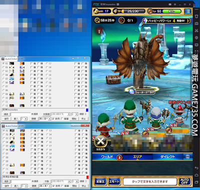 版本更新說明 v0.998 (2017/01/10) 1. 右下角連線文字有全域滑鼠按鍵按下後的延遲時間設定 ( 魔物獵人 MHXR 建議為 100, 因為按太快 MHXR 判讀不到 ) 2. 圖形辨識區按下滑鼠右鍵現在會出現浮動視窗, 用來設定特定功能 畫面設定如下 編號 3-01 (48) 表示為第3頁第1個辨識, 全域編號為 48 ( 用來停止或執行其他辨識用 ) 轉為鍵盤命令 原本為點擊滑鼠, 轉為鍵盤輸出 編輯鍵盤命令 鍵盤輸出的命令 停止其他辨識設定 動作期間停止其他辨識命令 ( 非動作期間自動還原 ) 執行其他辨識設定 動作期間執行其他辨識命令 ( 此辨識不執行滑鼠或鍵盤動作 ) 設為預設值 回復成預設值 離開 離開 v0.985 (2016/04/06) 1. ALT + 截圖區現在可以重新抓圖 2. FFGM: 新增 Battle End Timer, 避免 FFGM 的 bug ( 打不死的怪 ) 3. Ctrl + Load ( 指定 PAGE ) 視窗也會自動修正原先儲存資料至目前視窗位置 4. 新增 停止動作計時器功能 ( 2hrs event 等等 ) 5. 新增 1/4 辨識點 (Ctrl-Shift-[+]) 並取消 Ctrl-Shift-[-] 功能 6. 增加 Alt-Radio 將辨識點轉為 Script 命令 轉為 Script 命令時下一個 Script 為 '9' 時跳過 7. 取消重置技能 (改由 戰鬥 按鈕重置) 自動技能:辨識點 09 改為 11 ( 08 取消 ) 自動技能:辨識點 06 改為 10 自動技能:辨識點 07 改為 09 自動技能:增加辨識點 06 07 08 辨識轉技能部分可在辨識點 ToolTip 設定每回合執行次數 (特殊武器) 8. 現在會儲存 PAGE6 的設定狀態 (ToolTip 部分) v0.91 (2016/01/07) 1. 修改 FFGM 自動動作的設定方式, 原本由 ToolTip 設定動作, 現在改為簡易 SCRIPT 請參考 FFGM 設定部分 2. 啟動 / 預覽 改為圖示按鈕, 新增單機模式 ( 多開不同步 ) v0.85 改名為 AutoClicker 後正式公開的第一版 魔物獵人 MHXR 設定方式 1. 請在連線文字那邊按下後將滑鼠按下等待時間設為 100 2. 設定好你的全部辨識區 ( 請參考設定說明 ) 讓他可以重複一直循環遊戲 3. 如果你的武器動作只是很單純的點擊而已就直接用滑鼠動作 4. 這邊為太刀使用範例 A. 請將夜神模擬器的十字按鍵拉至動作鈕區 上下左右設為 WSAD B. 設定一個單鍵為動作 動作區中間作為點擊 按鍵設為 Q C. 在動作識別區按下滑鼠右鍵, 設定鍵盤命令為 W+W--+--Q+Q--+-Q+Q--+-Q+Q--+-Q+Q--+-Q+Q--+-Q+Q--+-Q+Q--+-Q+Q--+-Q+Q--+-Q+Q--+-Q+Q--+-Q+Q--+- D. 增加一個紅色集氣滿後的辨識區 ( 請使用 Ctrl-Shift-[+] 設定1/4辨識點 ) 擷取區 為紅色氣條最下方 E. 紅色辨識區鍵盤命令設為 W+W--+--Q*Q*Q*Q*Q*+- F. 將 C 跟 D 的動作轉為鍵盤動作即可, 遊戲實際運作畫面如上面 YouTube 所示 Final Fantasy GrandMasters 設定方式 這邊介紹在 Final Fantasy GrandMasters 的特殊用法 AutoClicker 可以支援 8 個設定, 每個設定有 6 頁, 每頁有 24 個辨 識點可以設定 比較特殊的是第 6 頁, 這邊我設計成 Final Fantasy GrandMasters 跟 Mobius Final Fantasy 專用 (第 1-5 頁是你設定成什麼, 辨識成功就按下什麼) Final Fantasy GrandMasters ( 簡稱 FFGM ) 的第 6 頁特殊用法為 辨識點 6-1 到 6-12 6-1: 戰鬥技能1 亮起時使用 Ctrl-Shift-Alt-[+] 設定1/2辨識點 6-2: 戰鬥技能2 亮起時使用 Ctrl-Shift-Alt-[+] 設定1/2辨識點 6-3: 戰鬥技能3 亮起時使用 Ctrl-Shift-Alt-[+] 設定1/2辨識點 6-4: 戰鬥技能4 亮起時使用 Ctrl-Shift-Alt-[+] 設定1/2辨識點 6-5: 戰鬥技能5 亮起時使用 Ctrl-Shift-Alt-[+] 設定1/2辨識點 6-6: 戰鬥技能6 亮起時使用 Ctrl-Shift-Alt-[+] 設定1/2辨識點 6-7: 戰鬥技能7 亮起時使用 Ctrl-Shift-Alt-[+] 設定1/2辨識點 6-8: 戰鬥技能8 亮起時使用 Ctrl-Shift-Alt-[+] 設定1/2辨識點 6-9: 戰鬥畫面攻擊已亮時使用 Ctrl-Shift-Alt-[+] 設定1/2辨識點 6-10: 戰鬥畫面攻擊未亮時使用 Ctrl-Shift-Alt-[+] 設定1/2辨識點 6-11: 設定 Battle End Timer 計時終了時右上角 MENU 1/2辨識點 再用Ctrl-Alt-[+] 設定點擊 リタア 座標 ( 6-11 可以不用設定, 程式有預設座標, 如果無法自動離開戰鬥時才需要設定 ) 6-12: 地圖畫面的上方任務圖示, 使用 Ctrl-Shift-Alt-[+] 設定1/2辨識點, 設定完這個辨識點 後請自行按下任務圖示, 會將任務怪拉到畫面中央, 請再按下 Ctrl-Alt-[+] 設定點擊位 置 (任務怪中央) 使用 SCRIPT 來設定攻擊順序, TP 不足時會使用普通攻擊 例如 範例圖片中 1 為物攻上升 2 為氣孔彈 3 為短劍特大攻 4 為雙龍腳 5 為不意三 簡易腳本設定為 1152299999999999 表示 兩次物攻上升後使用不意三再使用兩次 氣孔彈然後一直普攻(集TP) 再次循環 等待命令為 w, 所以你如果開場需要先等待兩個週期則改為 ww1152299999999999115229999999999911522999999999991152299999999999 戰鬥結束後如果需要等待時間請再命令最後加上 ~ 例如 ww115229999999~~~ 這樣會開場等待 2 個週期, 戰鬥結束後會等待 30 秒 ( 一個 ~ 是 10 秒鐘 ) 等待時間是給用在聖誕任務或是新年任務之類用的 ( 等怪物重生以免跑太遠打到 NM ) PS. 你必須使用 1-5 頁來週期性按下選關, 任務完成, 任務失敗, 及其他按鈕 才能配合第 6 頁達到全自動掛機的功能 使用其他辨識頁配合第 6 頁的特殊用法 使用場景: 需要拆強化時 選擇 1至5 任何一頁, 使用 1/4 辨識點辨識 BOSS 的強化小圖示 ( 大血條上方 ) 取得辨識點圖形後按 ALT-[選擇鈕], 例如我把拆強化放在 6-4, 我就按 ALT-[04] 那個 選擇鈕, 這樣辨識到強化小圖示時就會轉為按 6-4 的拆強化 使用場景: 職業特殊武器(有使用次數) 在 BOSS 1/2 血量後使用 選擇 1至5 任何一頁, 使用 1/4 辨識點辨識 BOSS 的大血條被打到 1/2 以下 取得辨識點圖形後按 ALT-[選擇鈕], 例如我把職業專武放在 6-5, 我就按 ALT-[05] 