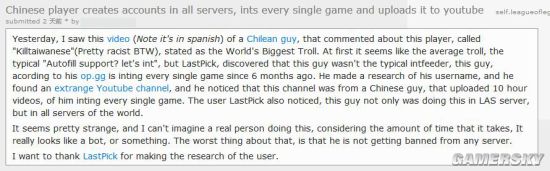 近日有《英雄聯盟》外國在網上看到一部視頻,內容是來自智利的一位主播在討論一個奇怪的中國玩家,就像我們在《LOL》中遇到的各種奇葩玩家一樣,這位在遊戲中就像一個演員,開場就各種送,讓人懷疑是不是對面猴子請