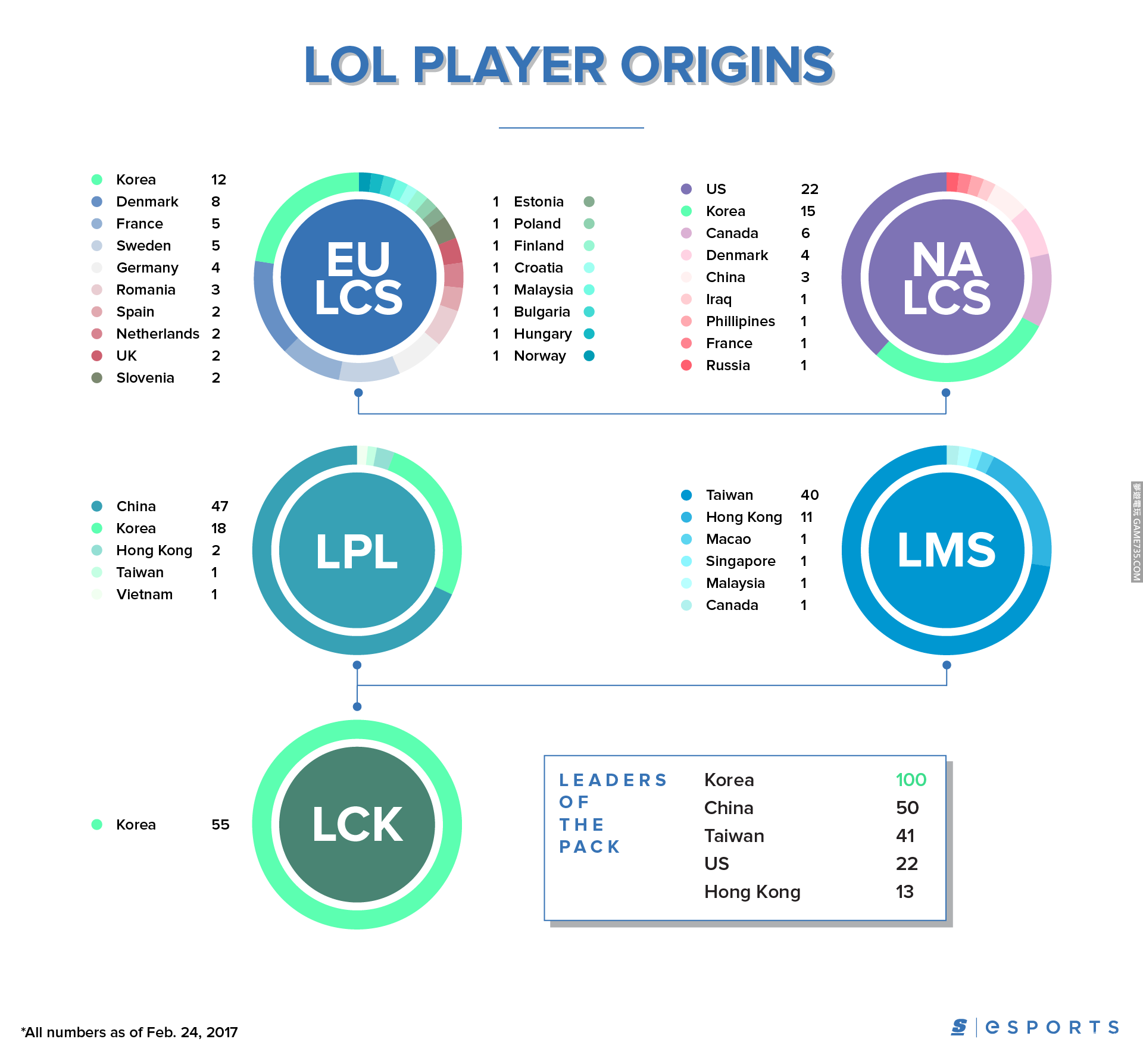 近日,theScore esports根據 LOL.esportswikis上的選手數據,做出了一份有關LOL五大賽區(NA LCS、EU LCS、LPL、LMS和LCK)選手國籍的分析圖。 你知道英雄聯盟五大賽區的職業選手都來自哪裡嗎? (圖1)從圖上可以看